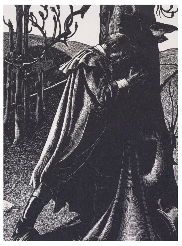 Maybe I’m just a romantic mycophile…but I see so many symbolic nods to Nature in this beautiful engraving. What do you think? Did Clare Leighton intend to hint at a fracture in Catherine, an unavoidable heart rot caused by her love for Heathcliff? A foreshadowing of a fracture in Heathcliff, perhaps?