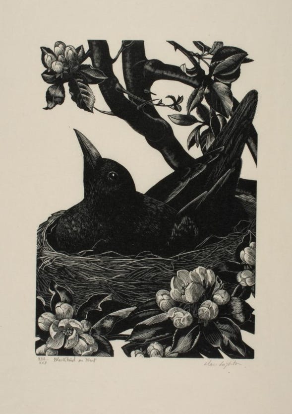 I believe Brontë is referring to the ring ouzel (Turdus torquotus); the Norton Critical Edition of Wuthering Heights simply refers to the birds as blackbirds, but they are smaller, slimmer and boast a white breast band. The engraving of a blackbird on a nest, by Clare Leighton, likely depicts the Eurasian blackbird (Turdus merula).