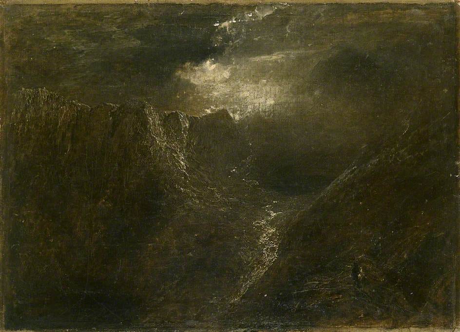 Gimmerton Beck runs between the Grange and the Heights, dividing the two—and the sough (or, ditch) drains from the Blackhorse Marsh into the beck (or, brook). The light from the full moon creates a silvery vapour. Wuthering Heights is obscured; youthful past—her history, which included Heathcliff—is now imperceptible.