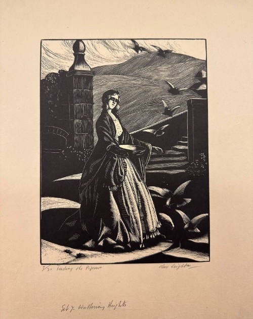 After Nelly’s incident with Hareton; Heathcliff arrives at the Grange, and Catherine is occupied feeding some pigeons. Artist Clare Leighton made a lovely woodcut etching of this scene…