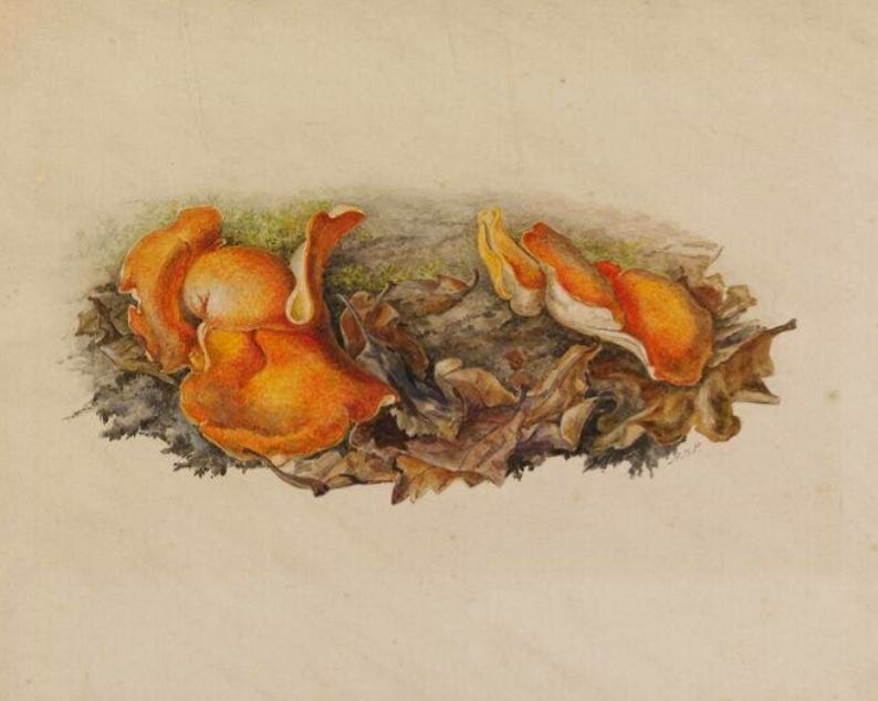 Brontë, who knows her land and understands myriad stages of grief, writes that Cathy stared a long time at the ‘lonely, blossom trembling in its earthy shelter.’ Refusing to pick it, she saunters on, ‘pausing, at intervals, to muse over a bit of moss, or a tuft of blanched grass, or a fungus spreading its bright orange among the heaps of brown foliage; and ever and anon, her hand was lifted to her averted face.’3